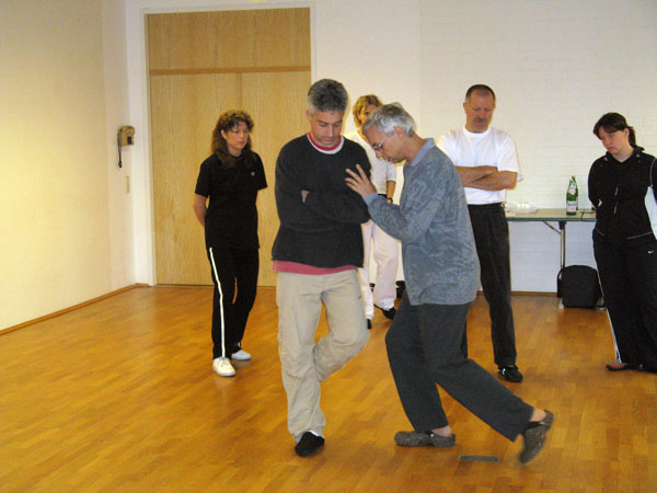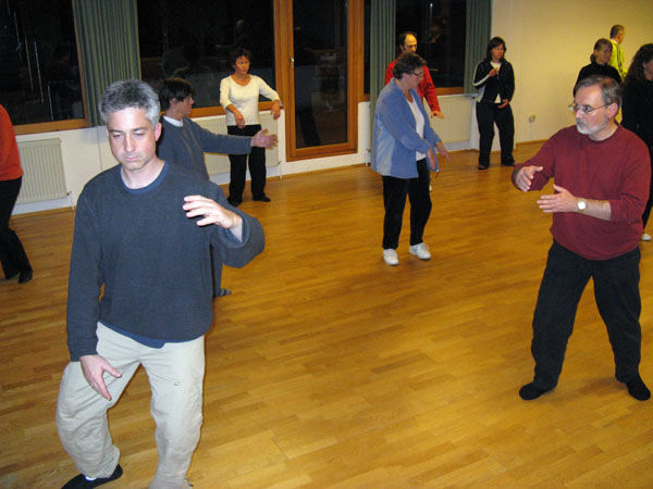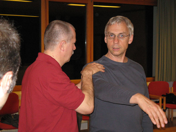Schön locker lassen | Noch mehr entspannen | Ganz ganz entspannt | Gleich rutscht die Hand ab ... | Die Schwerkraft wirkt | Beide Arme - Struktur und Entspannung | Da ist ja das Schulterblatt ... | ... noch eins ... | ... und noch eins ... | Fühlt sich komisch an | Und was kann man damit machen? | Schulterblatt sinkt ... | ... Arm steigt ... | Entspannen in Brust ... | ... und Rücken | Auch die Beine dürfen loslassen | ... und ganz entspannt | ... nach außen kippen | "Swinging Legs" | Hosenbeine hochkrempeln | ... und Kniescheiben lockern | Kaum zu glauben | Die Mitte entspannen ... vorne ... | ... und hinten | Sinken in den Leisten | Wie macht er das? | ... mal genauer hinschauen ... | Ach so | Hm, und was kommt jetzt? | Krafteinwirkung auf die Mitte | Immer schön lächeln und nach unten ableiten | Ich zeig's nochmal ... auch in der Leiste loslassen | Und jetzt jeder in seiner Form | ... und davon gab's einige | Wiederholung | Hm, komisches Peng | Ah, jiejin (receiving energy) | Am Abend wurde es noch lustiger ... | ... ohne Kommentar ... | Der unbeugsame Arm | Das Geheimnis von Struktur und Entspannung | Jetzt kommen wir endlich zum pushen | Erst noch mal ein bischen ausruhen | Auf der Schulter liegt es sich gemütlich | Jetzt wird's aber ernst ... | ... und tschüß !! | Das geistige Sinken läßt sich so schlecht fotografieren | Die Gruppe | Bis zum nächsten Mal vom 11. - 13. April 2008 in Remscheid ! |