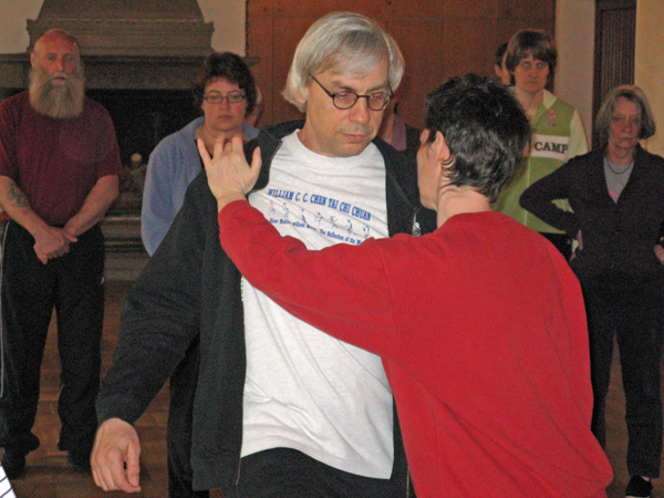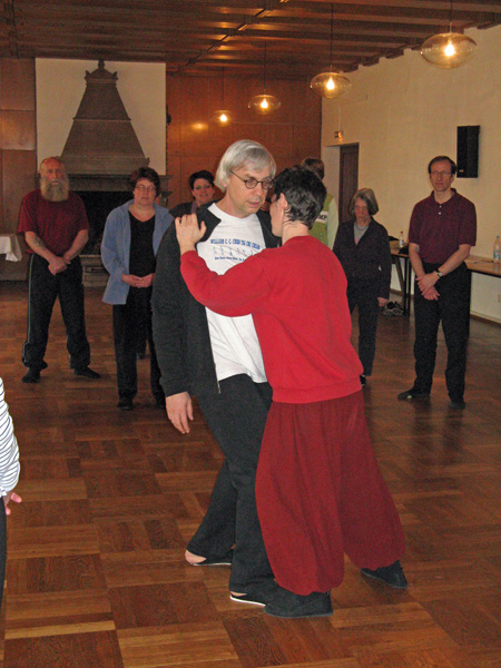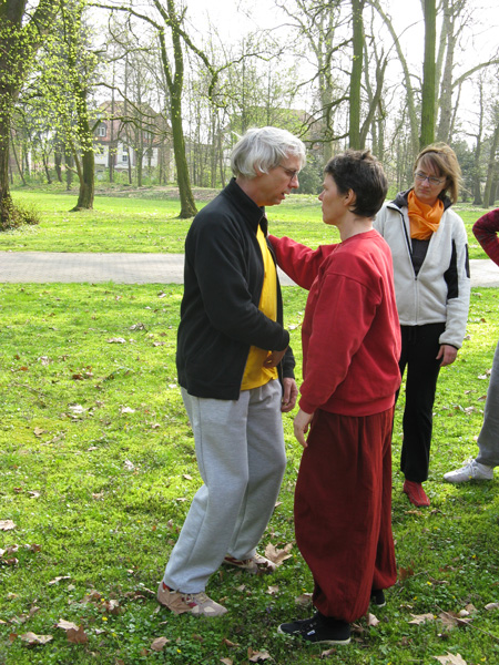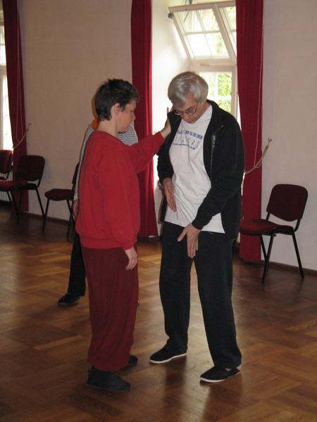 Es geht wieder los ... | Entspannen, ... | ... bewegen und sinken. | Während es oben wegsinkt ... | ... dehnt es sich ... | ... in der Mitte aus ... | und flutscht dann durch die Leisten. | Tja, dann unser Lieblingsthema: Wie kommen die Arme eigentlich hoch? | Ah, schöne Schulterblätter! | Vielleicht helfen die uns? | Äh, ja, theoretisch verstanden! | Auf der einen Seite pushen ... | in die andere Leiste sinken ... | ein bischen mehr Druck bitte. | Und üben. | Kommen wir zu den Armen ... | ... meine Damen ... | Schulter sinkt, Ellbogen sinkt, Hand kann steigen. | Jetzt die 2. Übung - sinken in beide Leisten ... | Schultern sinken wieder und Arme steigen von der Mitte aus. | Alle mal üben - Epi korrigiert. | Endlich an der frischen Luft - Renate freut sich! | Wir üben mal zu dritt ... | Karin steht und sinkt, Christine pusht und Susanne fühlt. | Das muß man doch im Bild festhalten! | Und auch diese drei ... | und diese drei. | Hier wird diskutiert ... | Ok, ich zeig's nochmal! | Hatten nicht vorhin schon mal das Vergnügen? | Aber jetzt ist's ein bischen anders ... | Anwendung zur 3. Übung. | Also mal wieder sinken und fühlen. | Da geht's lang! | Hier sinkt es. | Und wieder in ... | ... Dreier-Gruppen ... | ... üben ... | ... und freuen. | Das ist intensive Arbeit mit viel Achtsamkeit ... | ... Körperwahrnehmung ... | ... Spüren ... | ... Konzentration ... | ... Fühlen ... | ... und nach innen hören! | Epi scheint ganz zufrieden. | Wir sind ja auch fleißig ... | und hoch motiviert! | Jetzt mal alle im Kreis die 3. Übung. | Da fällt mir noch was ein ... | Wie wäre es mit dieser schönen Anwendung? | Schon passiert! | Ich zeig's nochmal ... | Da ist es. | Ob wir wohl durch die Lücke kommen? | Und wieder zur 3. Übung ... | ... hallo, ähm, die Arme steigen vor die Mitte ... | ... hallo, beide Arme an die gleiche Stelle vor der Mitte ... | ... natürlich abwechselnd, aber gleiches Ziel. | Ein Mann mit Wurzeln wie ein Baum! | Weiter geht's drinnen mit der 4. Übung. | Auch dazu gibt's Anwendungen ... | ... funktioniert! | Und jetzt diese hier ... | ... bischen mehr Druck bitte. | Eigentlich ist es ganz einfach ... | Struktur, Entspannung, Sinken in Wellen ... | und nichts machen. | Es gibt ja soviele Achsen ... | ... hier ... | ... und hier ... | ... alles klar? | Und jetzt nochmal viele Wellen durchlaufen lassen! | Bin gerade bei Welle 25! | In der Ruhe liegt die Kraft. | Und dann noch das Säckchen-fangen-Spiel ... | ... sogar mit zwei Säckchen! | Auf ein Wiedersehen vom 27.-31. März 2010 in der Akademie Klausenhof, 46499 Hamminkeln. |